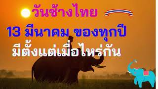 ที่มา: คณะอนุกรรมการประสานงานการอนุรักษ์ช้างไทยริเริ่มขึ้น เพื่อให้คนไทยตระหนักถึงความสำคัญ หวงแหน และช่วยกันอนุรักษ์ช้างไทยที่ลดจำนวนลง เหตุผลที่เลือกวันที่ 13 มีนาคม: เป็นวันที่คณะกรรมการคัดเลือกสัตว์ประจำชาติ มีมติให้ "ช้างเผือก" เป็นสัญลักษณ์ของประเทศไทย เมื่อวันที่ 13 มีนาคม พ.ศ. 2531 ต่อมาคณะรัฐมนตรีได้เห็นชอบให้เป็น "วันช้างไทย" ในวันที่ 26 พฤษภาคม 2541 และลงราชกิจจานุเบกษาเมื่อ 29 พฤษภาคม 2541